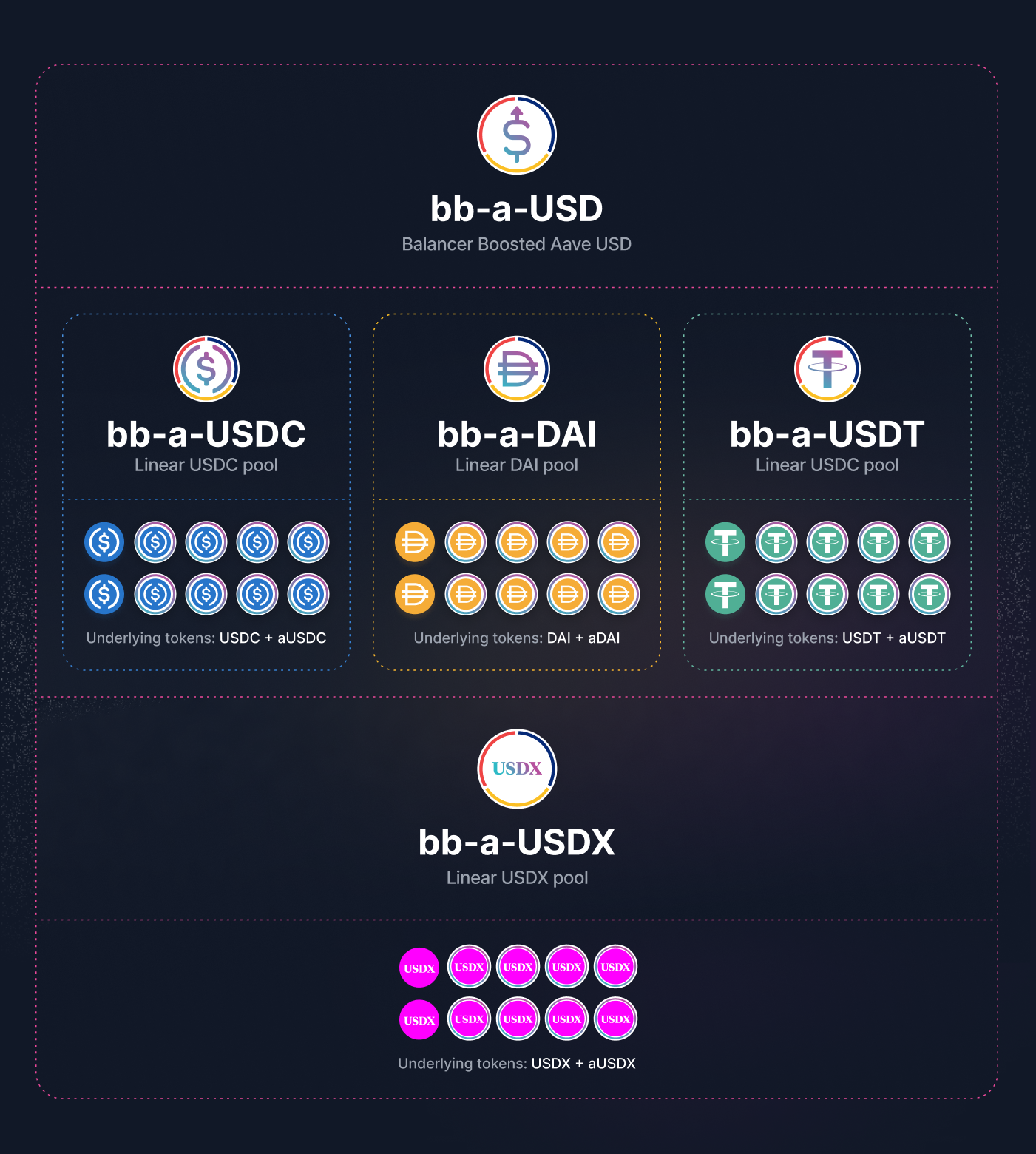 For example, if a creator wanted to build liquidity around a new stablecoin, USDX, with aToken aUSDX, a pool creator could make an Aave Linear Pool bb-a-USDX and pair it with BPT from the existing bb-a-USD. This would create trading pairs with USDC, USDT, DAI, USDX, and all of their respective wrapped aTokens. This architecture keeps all of the underlying tokens of bb-a-USD in the same pool while still opening simple swap paths to the newly paired tokens.